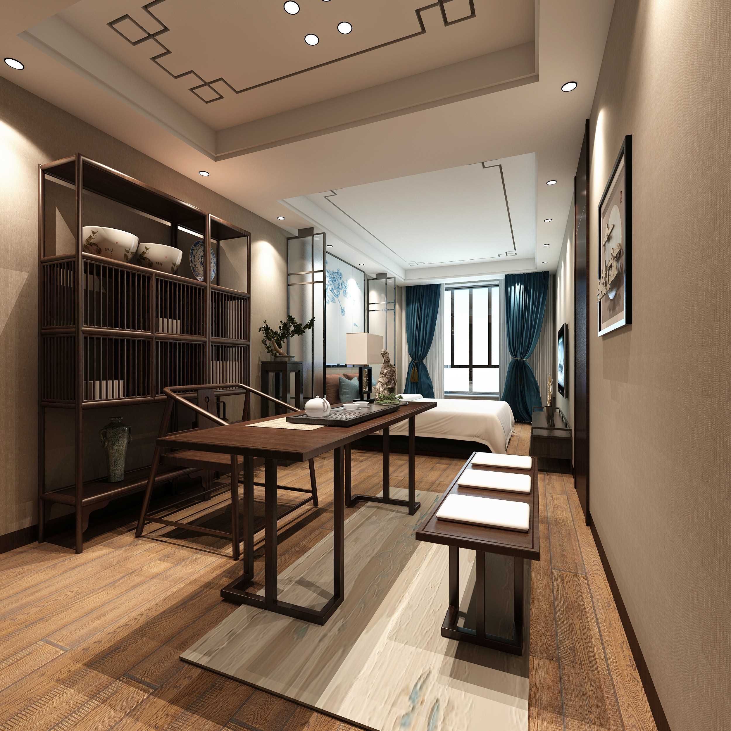精品酒店房间墙面接近地面的部分可以术质装饰板或纺织品软包墙面造型,既能够起到美化墙面的作用,又能够防护墙体和保护人体行为安全。选用装饰材强的古玩柜,突出文化艺术品位则能恰到好处。考虑整个酒店空间环境、光线及家具的陈设风格等诸多因素,表面材料应与酒店环境相统一,不宜有较大的变化。